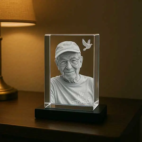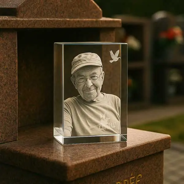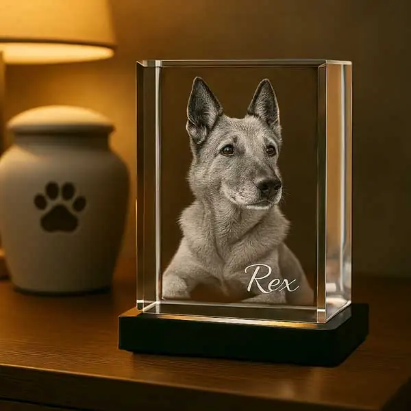 Ce bloc funéraire animal 3D 12 cm capture la présence de votre compagnon (chat, chien ou NAC) grâce à une gravure 3D interne d’après votre photo. Sans encre ni film, l’image est inscrite à l’intérieur du verre et ne s’efface pas. Un hommage sobre, lumineux et résistant pour honorer la mémoire de votre animal.