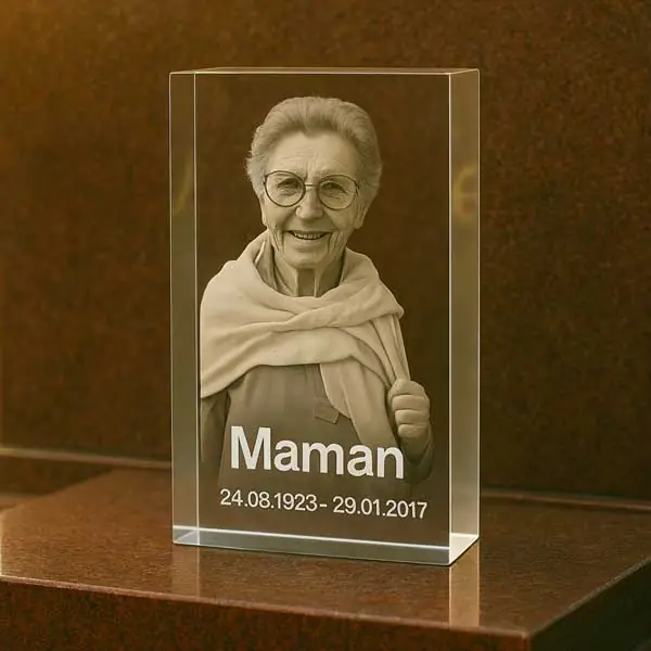Ce bloc funéraire photo 3D 18 cm réunit sobriété et résistance : la gravure se forme au cœur du verre optique, à l’abri des rayures et des intempéries. Le format portrait (10 × 18 × 8 cm) convient parfaitement à un portrait individuel ou à un couple, avec possibilité d’ajouter nom, dates et courte citation.