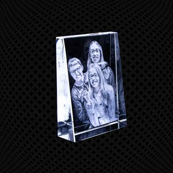 Le prisme trapèze verre 14cm (format portrait 14 × 10,5 cm) met en valeur votre image avec une gravure 2D nette et lumineuse. Sa base plus épaisse (~3 cm) et son haut affiné (~1,5 cm) lui donnent une excellente assise : à poser seul, comme un cadre photo 2D en verre élégant, ou à sublimer avec un éclairage.